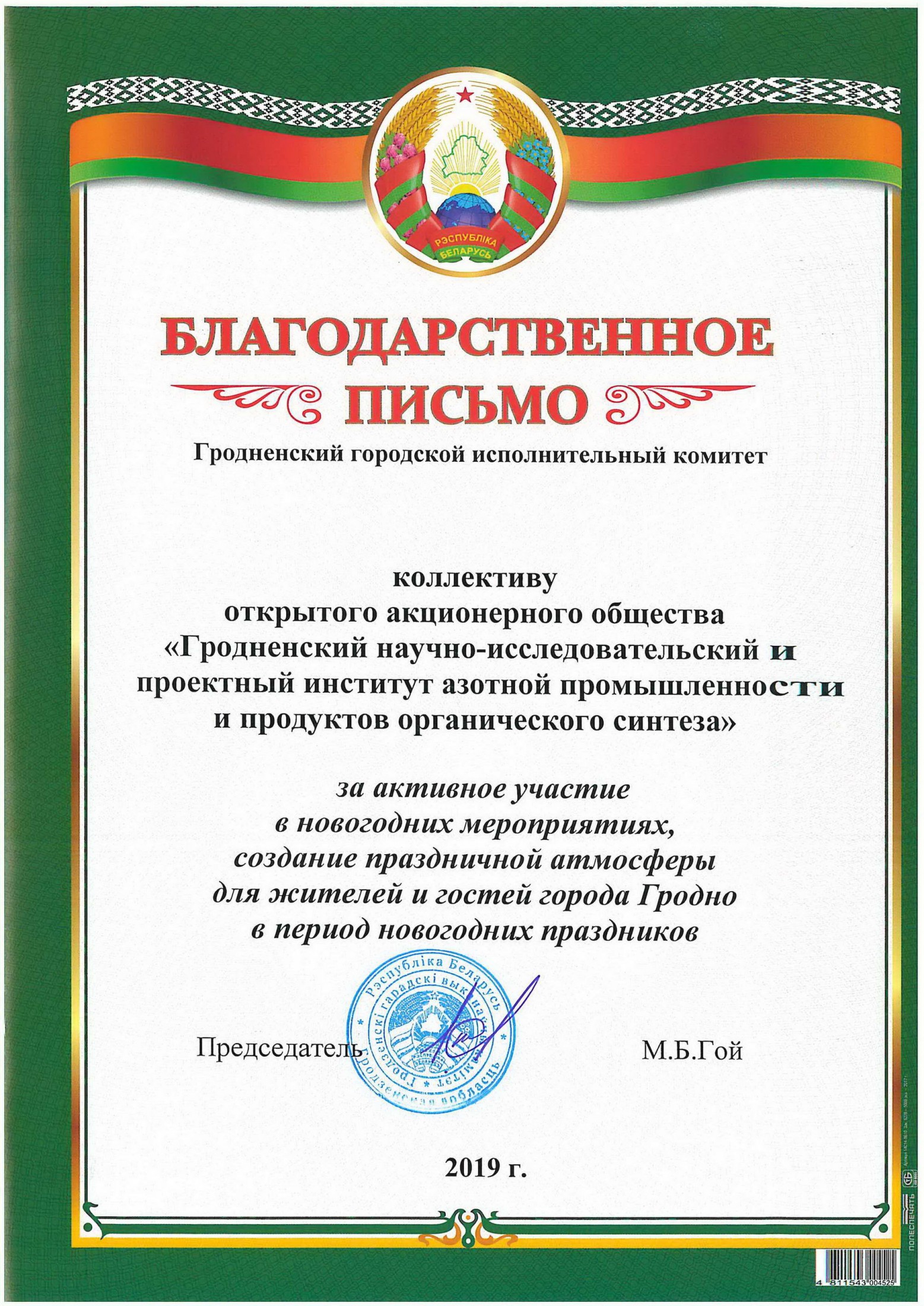 Активное участие ОАО «ГИАП» в новогодних мероприятиях и создание праздничной атмосферы для жителей и гостей города Гродно в период новогодних праздников отмечено благодарственным письмом Гродненского городского исполнительного комитета