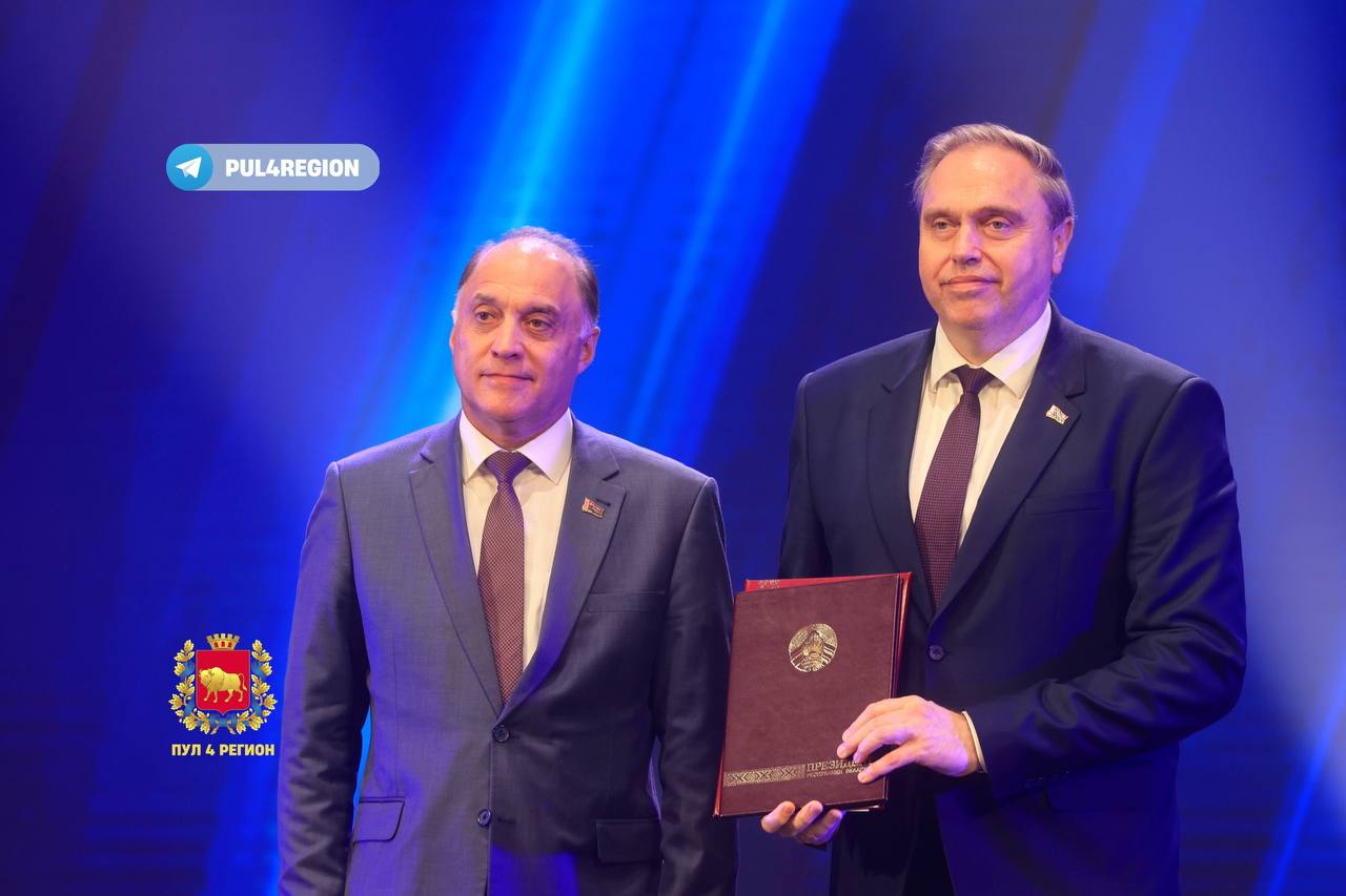 Приветственный адрес Главы государства в ходе торжественного собрания в областной филармонии зачитал Государственный секретарь Совета Безопасности Республики Беларусь Александр Вольфович